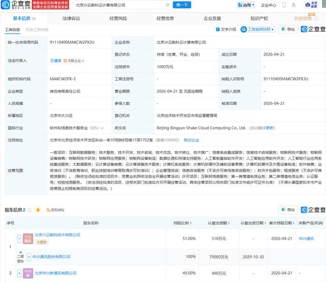 企查查APP显示,近日,北京兴云数科云计算有限公司成立,法定代表人为王健雄,注册资本为1000万元,经营范围包含:物联网技术研发;物联网应用服务;人工智能基础软件开发;人工智能应用软件开发等。企查查股权穿透显示,该公司由中兴通讯(000063.SZ)全资子公司北京兴云数科技术有限公司、北京中兴新通讯有限公司共同持股。