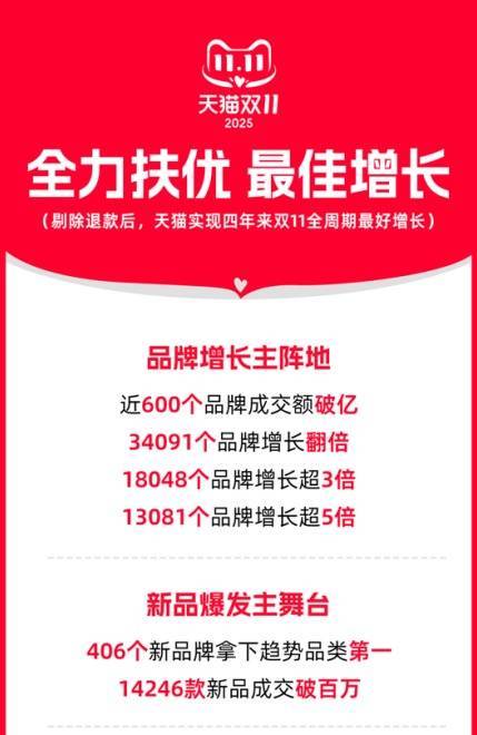 11月15日凌晨,天猫发布了“双11”全周期战报,以剔除退款后的成交来看,天猫实现了四年以来“双11”全周期最好的一次增长,其中,近600个品牌成交破亿元。