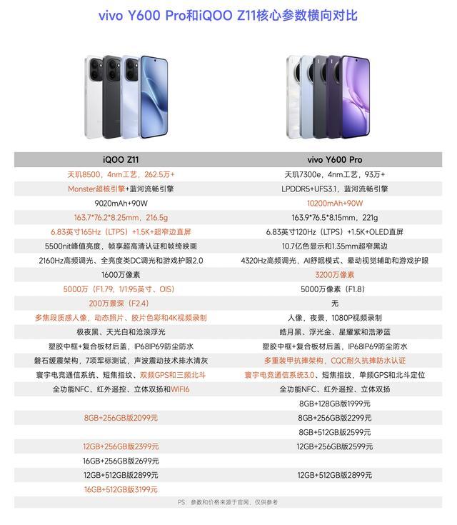 在显示方面,iQOO Z11的优势是165Hz刷新率,还有5500nit峰值亮度、全亮度类DC调光和游戏护眼2.0等等,vivo Y600 Pro的优势是晕动视觉辅助和4320Hz高频PWM调光。至于影像系统,vivo Y600 Pro的优势是32MP前置摄像头, 适合对喜欢自拍的小伙伴。iQOO Z11的优势是后置50MP双摄,主摄为1/1.95英寸且支持OIS光学防抖,并且支持多焦段质感人像和4K视频录制等等。