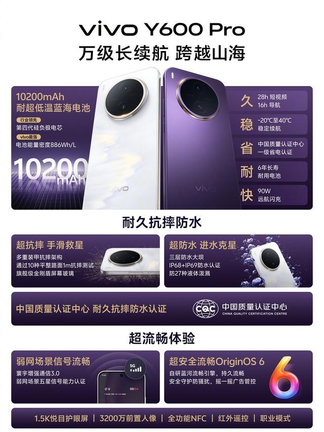 在耐用性方面,两款机型的表现都很不错,包括IP68和IP69防尘防水认证,还有各种抗跌耐摔的架构等等。从官方的宣传来看,vivo Y600 Pro在这方面更胜一筹,不过亓纪的建议依旧是不要主动尝试抗跌防摔,钢化膜和手机壳尽量都用上。通讯方面两个各有所长,vivo Y600 Pro支持寰宇电信通信系统3.0,iQOO Z11拥有双频GPS,三频北斗定位和WIFI6等等。
